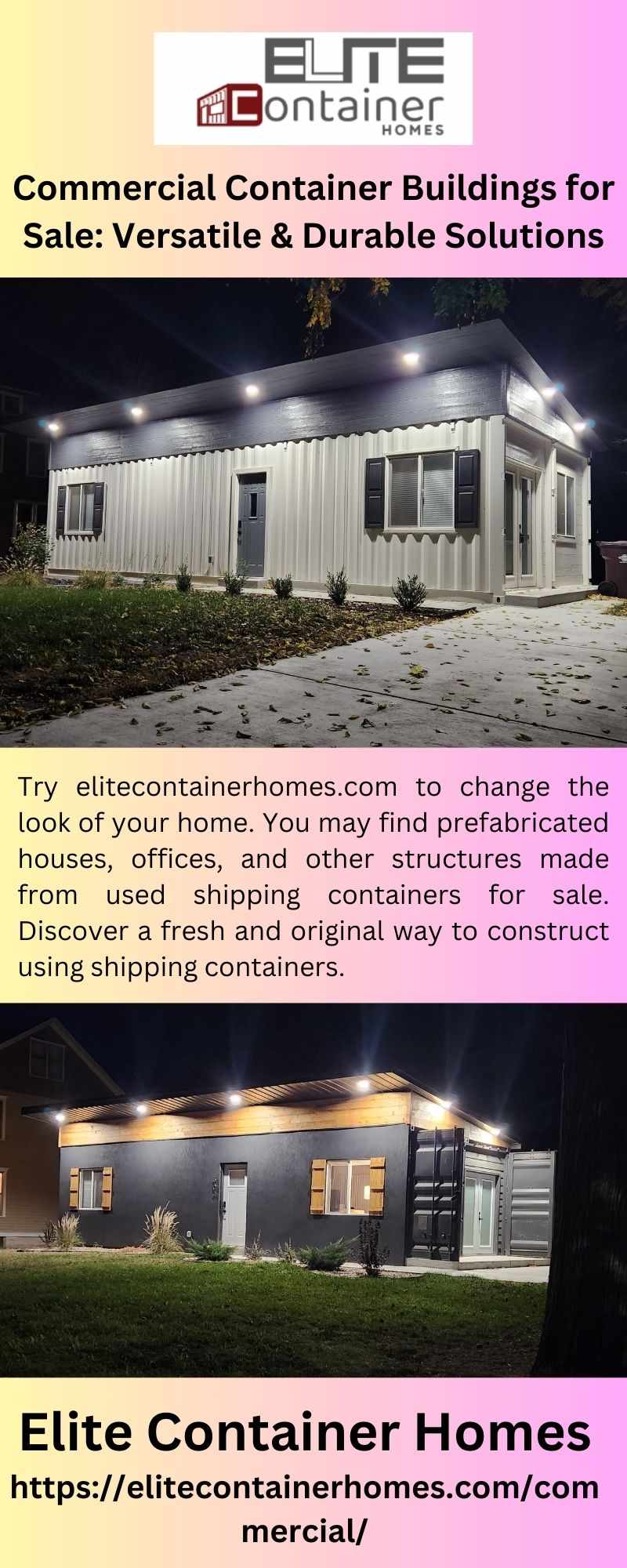Try elitecontainerhomes.com to change the look of your home. You may find prefabricated houses, offices, and other structures made from used shipping containers for sale. Discover a fresh and original way to construct using shipping containers.